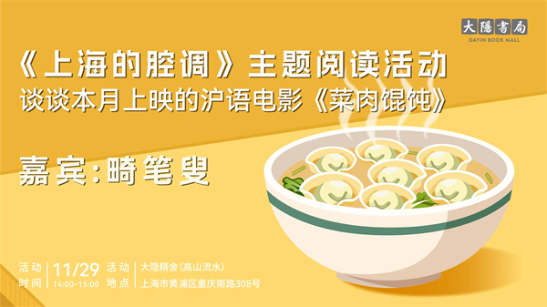 沪语电影《菜肉馄饨》日前正在热映,该片延续了上海电影一脉相承的艺术表达——皮是都市风貌,馅是时代特色,汤是人间温情。11月29日,畸笔叟老师将在大隐精舍与读者朋友们一起分享《菜肉馄饨》的电影故事,以及那隐藏在内里的上海文化内涵。