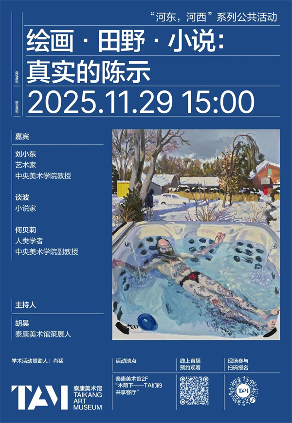 在刘小东的创作里,“真实”从来不是一个简单的审美判断,而更像是一种需要不断靠近、不断确认、甚至不断被重新看见的东西。本次活动以“绘画·田野·小说”为切入点,邀请社会学者何贝莉与小说家谈波,从各自的经验出发,共同讨论我们如何触摸“真实”。绘画里的现场、田野调查中的深入进入、小说写作在真实与虚构之间的游走——这些看似不同的路径,其实都与我们如何理解身体、亲密关系、地方记忆,以及如何讲述一个人、一群人或一个时代有关。