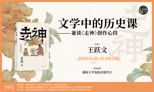 著名作家王跃文的首部历史文化随笔集《走神》,是收录作者几十年来考查历史和思索人性的34篇结晶之作。本次活动,王跃文老师将以《走神》为文本基础,以“明辨”“深思”“照今”为脉络,带领读者穿越历史迷雾,直面人性本质,更在人工智能浪潮汹涌的当下,为文学与人文精神正名。