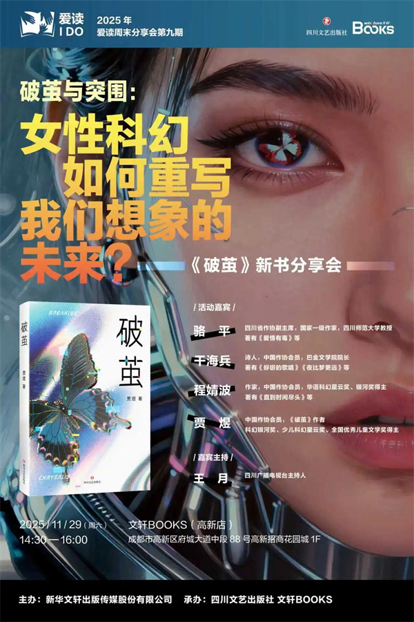 你是否好奇,当女性视角与科幻想象力碰撞,会诞生怎样颠覆传统的叙事?当《破茧》的书页被轻轻翻开,里面藏着的,不仅是未来时空的科幻故事,更是当代女性突破困境的精神共鸣。11月29日,我们邀请到《破茧》作者贾煜携三位重磅嘉宾做客文轩BOOKS高新店,一场关于“女性科幻与未来想象”的深度对话即将开启!带你拆解科幻世界的“女性力量”,见证中国科幻的破茧时刻。