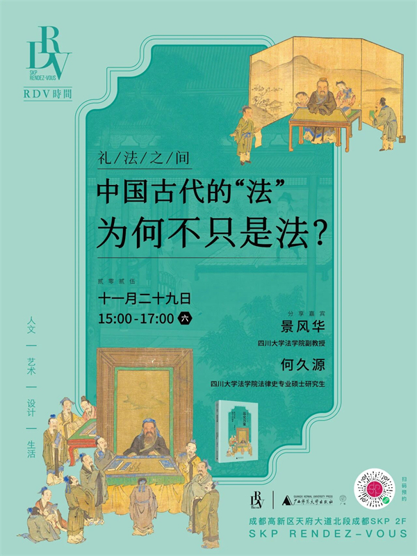 自汉武帝尊崇儒术以来,法律便全被儒家伦理和礼仪制度支配。以礼入法,成为中国古代法律的鲜明特征。在古代,法律不仅是维护等级、惩治犯罪的工具,还是浸润着人性温度,承载着理想秩序的载体。11月29日,特邀《法史万象:中国传统法律文化撷英》作者、四川大学副教授景风华老师与学生何久源一道做客成都SKP,开启一场“礼法之间:中国古代的‘法’为何不只是法”的新书分享,一同拆解礼法交融的深层逻辑,探寻中国古代法律的精神内核。