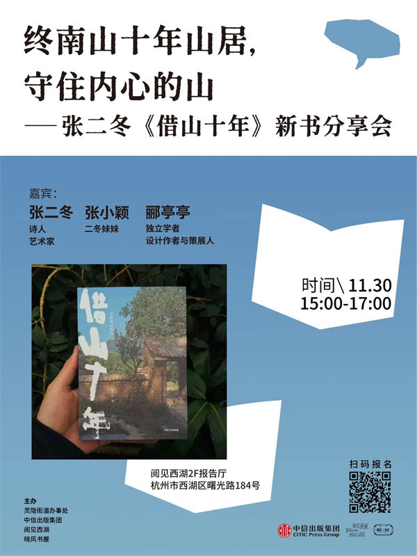 十一年山居之后,诗人张二冬带着他的第三本山中随笔《借山十年》,从终南山深处短暂下山,带着山里的风声与思索,来到阅见西湖。本周日,我们邀请你来到阅见西湖,与他一起聊聊这一段安静而坚决的生活:为什么一个人能在山里住十年?山里的四季与孤独怎样慢慢改变了他?而如今,他又如何继续守住“内心的那座山”?