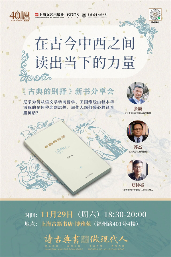 在中西古典热的当下,什么才是真正的“拿来主义”的古典研究,能够让古典在当下焕发新的生机?复旦大学古典学教授张巍在今年出版的新书《古典的别择》中,别具只眼地选择了尼采、王国维、周作人,展开他的论说。11月29日晚,张巍以及复旦大学古籍所教授、同时也是《抄工与学者》的译者苏杰,将做客401號下午茶,并从自身漫游中西的读书治学经验出发,对谈中西古典在当下的生机与力量。