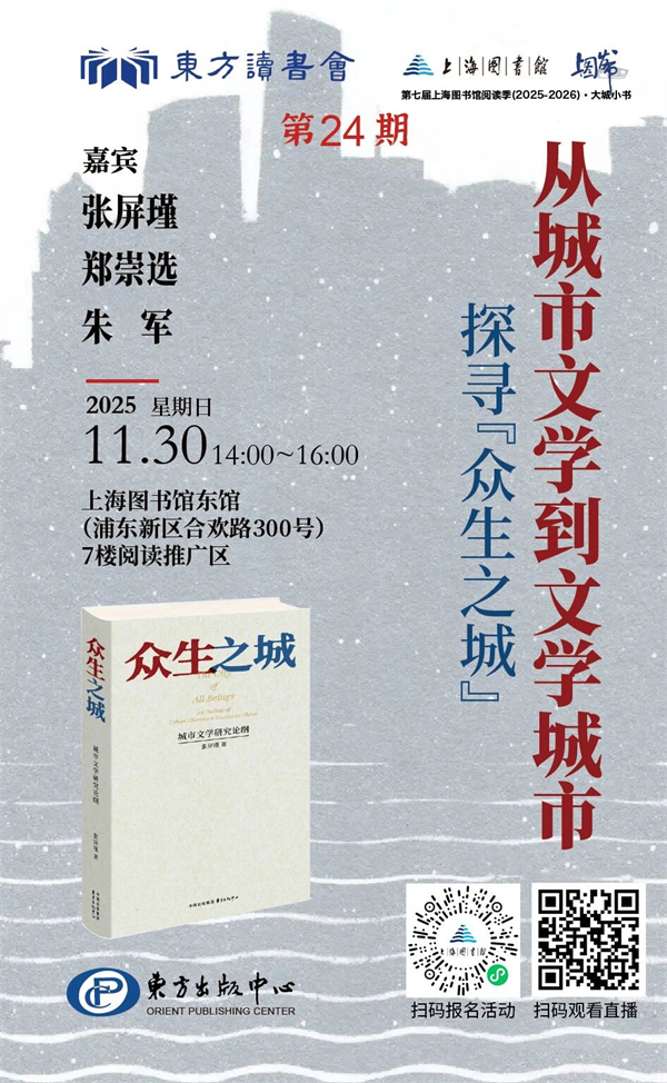 当城市成为现代人无法逃离的生存场域,当文学成为照见城市肌理的棱镜,我们该如何读懂城市的精神内核,又该如何在城市的褶皱里看见人的真实模样?《众生之城》兼具历史厚度与理论深度,以“城市文学”为核心线索,上溯晚清海上画派、海派京剧的视觉与空间觉醒,下探新世纪城市书写的多元面向,横跨现代与当代两个维度,拆解了从“海派”发轫到当代城市文学勃兴的完整脉络。11月30日下午,《众生之城》作者张屏瑾与郑崇选、朱军两位嘉宾将做客上海图书馆东馆,一起探讨城市与文学。