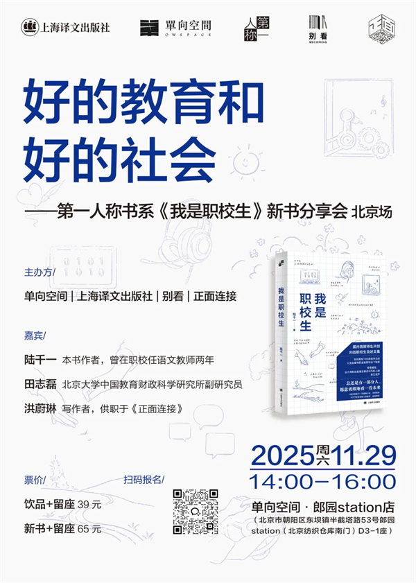 对年轻人来说,上中专、念职校到底意味着什么?而我们又该如何穿透偏见,重新认识这庞大而无声的群体?2025年10月,上海译文出版社“第一人称”书系002号作品《我是职校生》出版。本书的策划和写作,其中一个面向,正是对以上问题的尝试性解答。11月29日,《我是职校生》作者陆千一与北京大学中国教育财政科学研究所副研究员田志磊、写作者洪蔚琳,一起来到单向空间·郎园Station店,与朋友们一起聊聊何为良好的职业教育,乃至何为良好的教育——即更大程度的教育公平,如何得以实现。