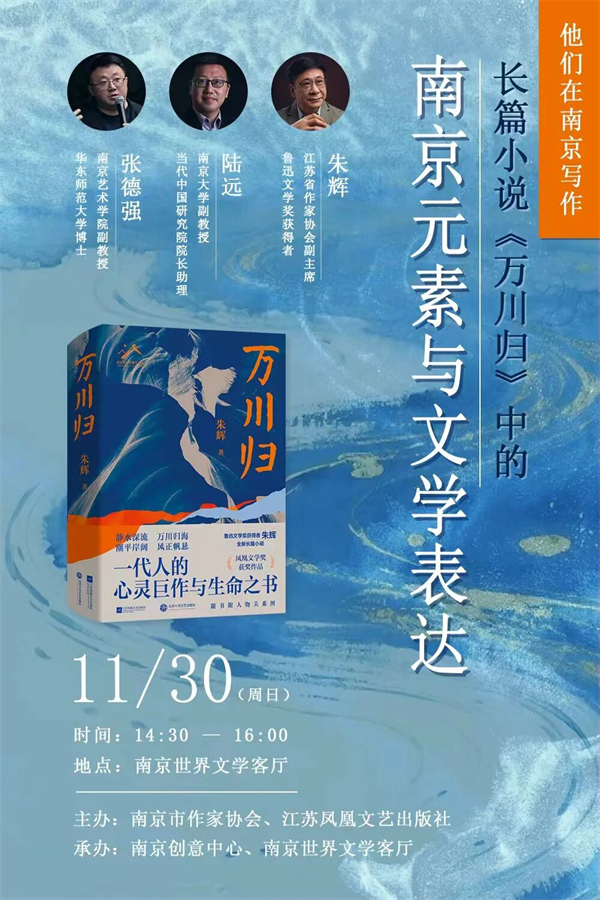 近期,鲁迅文学奖获得者、江苏省作协副主席朱辉的全新力作《万川归》由江苏凤凰文艺出版社出版。这部作品以三位60后知识分子的人生轨迹,书写了一代人心灵成长的史诗,书中个体命运与时代记忆交织,藏着诸多与南京这座城市相关的时代印记。11月30日,朱辉将携新书《万川归》与南京大学社会学院副教授陆远、南京艺术学院戏剧与影视学院副教授张德强做客世界文学客厅,围绕书中的南京记忆、时代变革下的城市书写、中年困境与生命意义等核心话题展开对话。