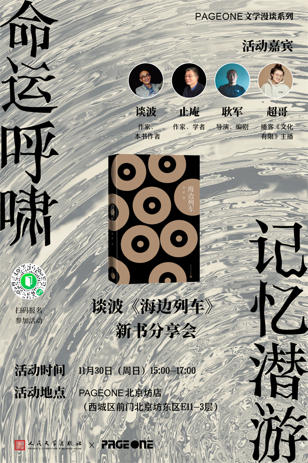 大连作家谈波,在他的首部长篇《海边列车》中,写下了这样一个关于1980年代东北工厂生活、选择与出走、爱情与命运、时代与个人的令人唏嘘感叹的故事,同时也更多了温煦明朗的色调。 11月30日下午,谈波将做客PAGEONE北京坊店,与作家、学者止庵,导演耿军,播客“文化有限”主播超哥,一起围绕新书《海边列车》聊聊1980年代的东北往事,聊聊如何在时代中安放自己,以及文学该如何讲述我们的生活。