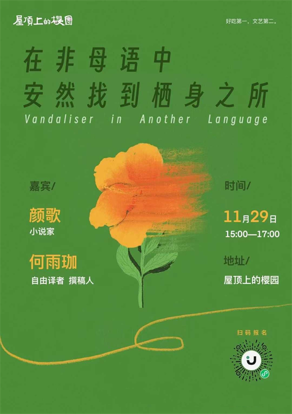 11月29日,颜歌与何雨珈将一起做客屋顶上的樱园。优秀的小说家与优秀译者一起聊“在非母语中安然找到栖身之地”这个主题。