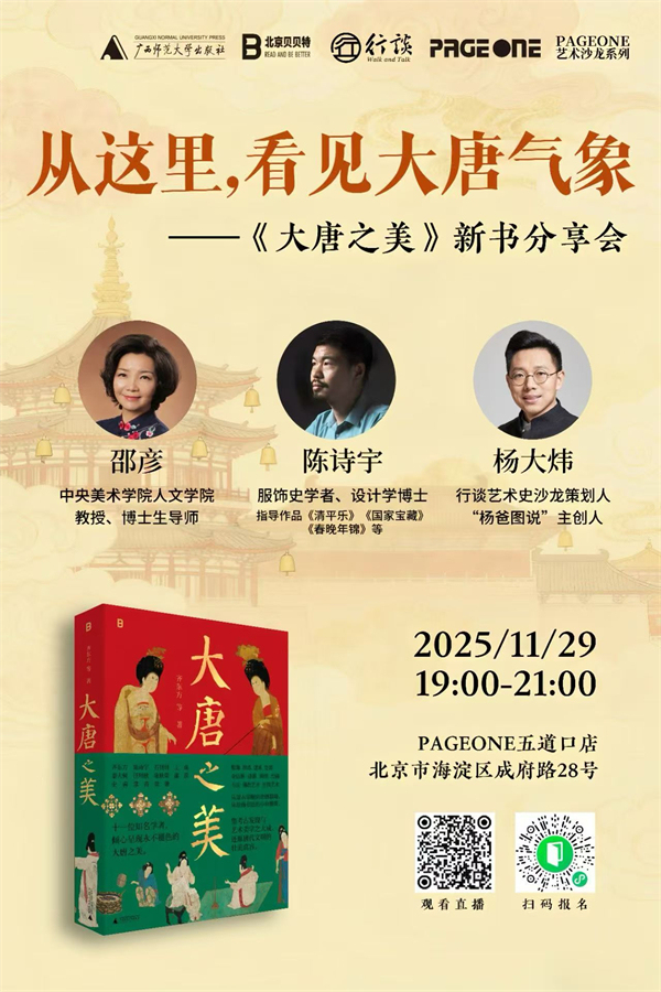 11月29日,《大唐之美》作者之一邵彦教授、陈诗宇博士将与策划人杨大炜做客PAGEONE五道口店,共同解锁大唐绘画、服饰艺术的神奇密码,开启古典之美高峰的华丽旅程。让我们一起在初冬静谧的夜晚,感受大唐盛世的美好与震撼。