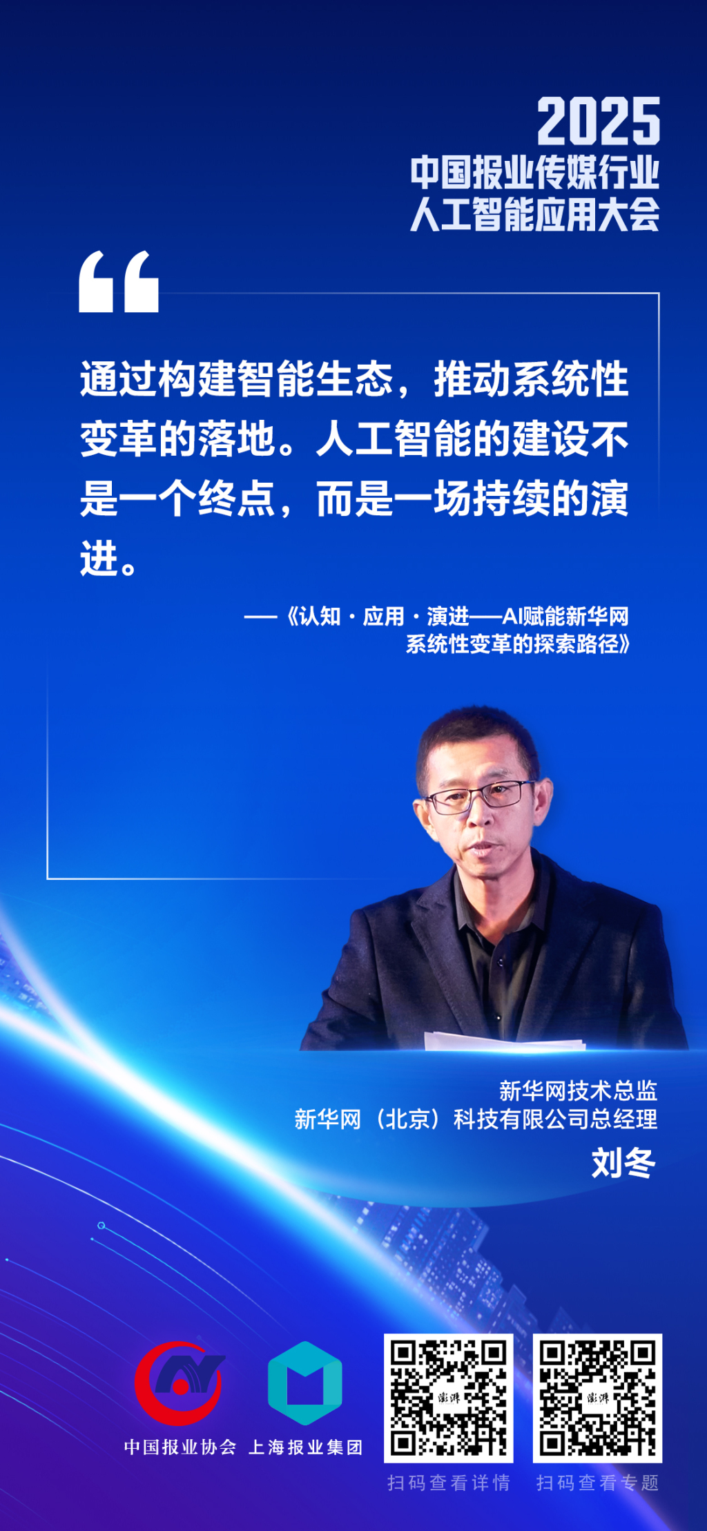 11月28日,2025中国报业传媒行业人工智能应用大会在上海举办。下午主题分享环节,新华网技术总监、新华网(北京)科技有限公司总经理刘冬,分享了AI赋能新华网系统性变革的探索路径。