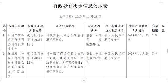 11月28日金融一线消息,中国人民银行厦门市分行行政处罚决定信息公示表显示,中国股份有限公司厦门集美支行因对预算收入划分办理监督履行不到位,被警告并处以罚款582639元。同时,许某岛对上述违法违规行为负有直接责任,被警告并处以罚款74792元。