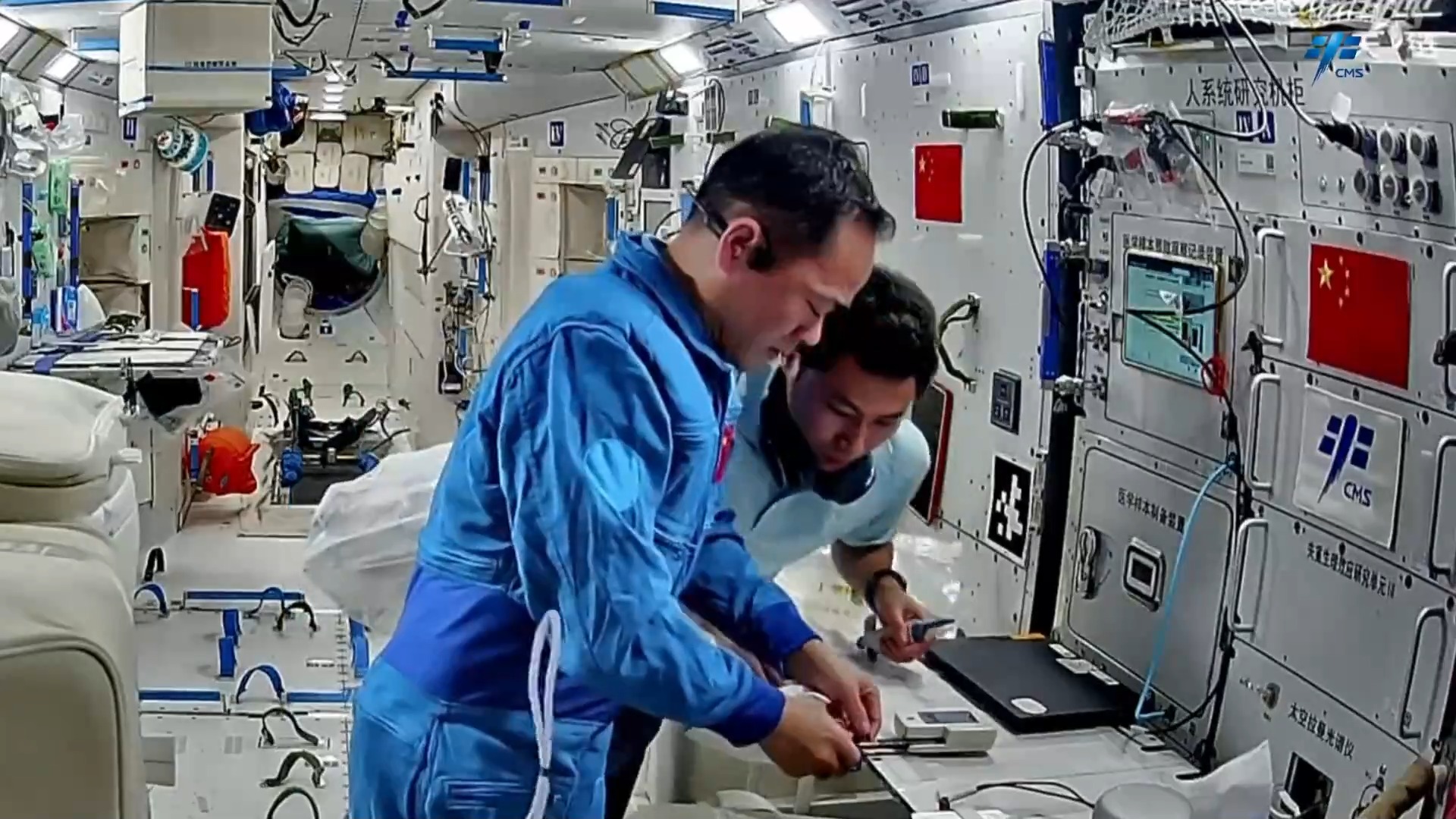 在微重力物理科学领域,乘组按计划完成了两相系统实验柜高速图像存储器更换、实验模块拆装等工作。